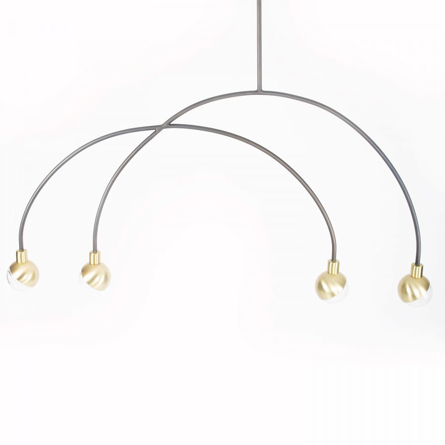 Arc pendant lamp mobile merkiltä 101 Copenhagen, suunnittelija Kristian Sofus Hansen & Tommy Hyldahl. Messinginvärisestä raudasta valmistettu kattovalaisin ja oksidoidusta messingistä valmistettu ripustus on saanut inspiraation 20-luvun funktionaalisesta Bauhausstil-tyylistä. Lampussa on 4 vartta, ja sen rakenne noudattaa periaatetta ”muoto seuraa funktiota”. Varjostimia voidaan kääntää 45 astetta, mikä luo miellyttävän valaistuksen. Kattovalaisimen näyttävä ja vaikuttava tyyli sopii täydellisesti ruokasalin pöydän yläpuolelle ja luo täydellisen valaistuksen. Kanta: E14 – 230V. Suositeltu valonlähde FILA E14 LED – 4W, 450 lumen – 2700 kelvin.