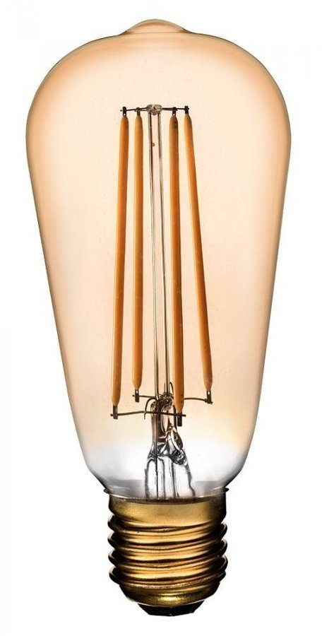Tunnelmallinen hiililankalamppu led-versiona. Edisonkupu 4W E27, 350lm 2200K. Kaunis lämmin keltainen valo (2200K) ja näkyvät pitkät hiililangat/filamentit. Tunnelmaa lisäävä meripihkan värinen kupu. Vähemmän hukkalämpöä, ei kuumene. Täysi valontuotto heti. Polttoikä 10 000h. Ei UV- tai IR-säteilyä. Energialuokka A+.