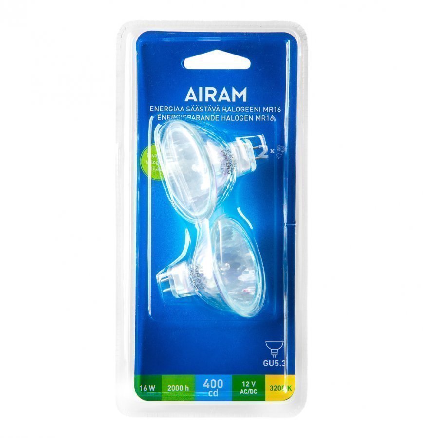 Airam 16W 12V MR16 30° GU5. 3 Halogen on energiaa säästävä halogeenilamppu. Teho 16W, jännite 12V. Kanta GU5. 3. Polttoikä 2000 h. Värilämpötila 2800 K. Energialuokka B. Pakkauskoko 2 kpl.