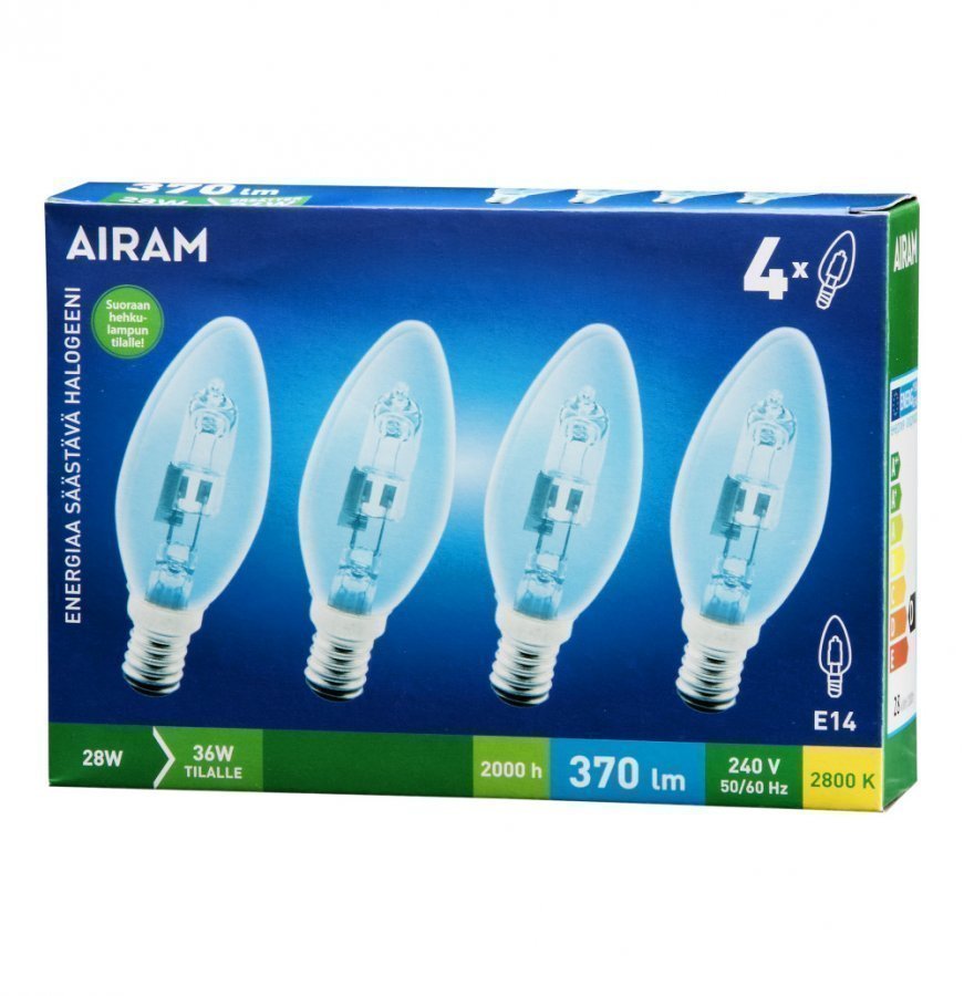 AIRAMIN energiaa säästävä kynttilä-halogeenilamppu. Sopii suoraan hehkulamppujen ja vakiohalogeenilamppujen tilalle. Se toimii vastaavalla tavalla säästäen 30% sähkönkulutuksesta. Halogeenilamppu on himmennettävissä täysin normaaleilla hehkulamppuhimmentimillä. Halogeenilamppu sopii myös kuumiin olosuhteisiin kuten esimerkiksi saunaan. Pakkauksessa 4 kpl kirkasväristä kynttilä-halogeenilamppua. Ominaisuudet: – Teho 28 W- 370 lumen- 50/60 Hz- E14 kanta- 2800 K- Ø 35/97- Polttoikä 2000 h