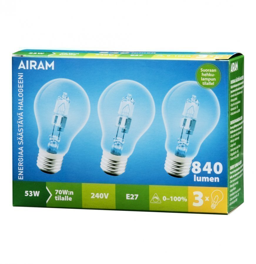 AIRAMIN energiaa säästävä halogeenilamppu vakiokuvulla. Sopii suoraan hehkulamppujen ja vakiohalogeenilamppujen tilalle. Ne toimivat vastaavalla tavalla säästäen 30% sähkönkulutuksesta. Halogeenilamppu on himmennettävissä täysin normaaleilla hehkulamppuhimmentimillä. Halogeenilamput sopivat myös kuumiin olosuhteisiin kuten esimerkiksi saunaan. Pakkauksessa 3 kpl kirkasväristä halogeenilamppua. Ominaisuudet: