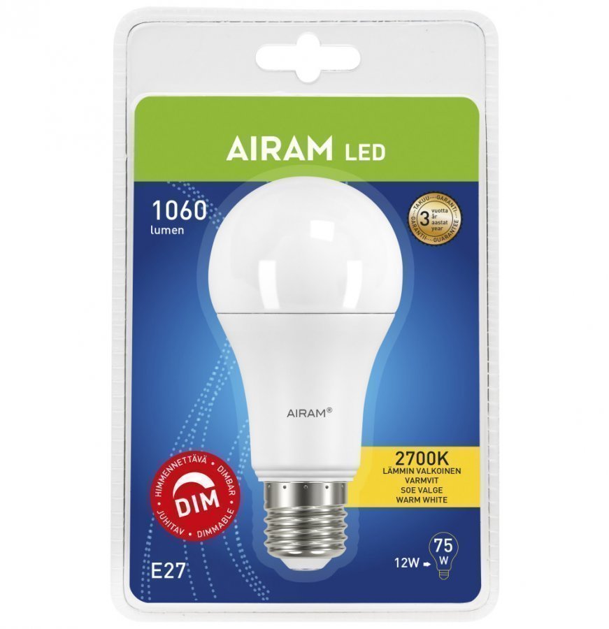 Airam LED-lamppu Himmennettävä. 1060lm, värilämpötila 2700 Kelviniä. Täysi valontuotto heti. Teho 12 W. Kanta E27. Polttoikä 25 000h. Ei UV- tai IR-säteilyä. Energialuokka A+. Takuu 3 vuotta.