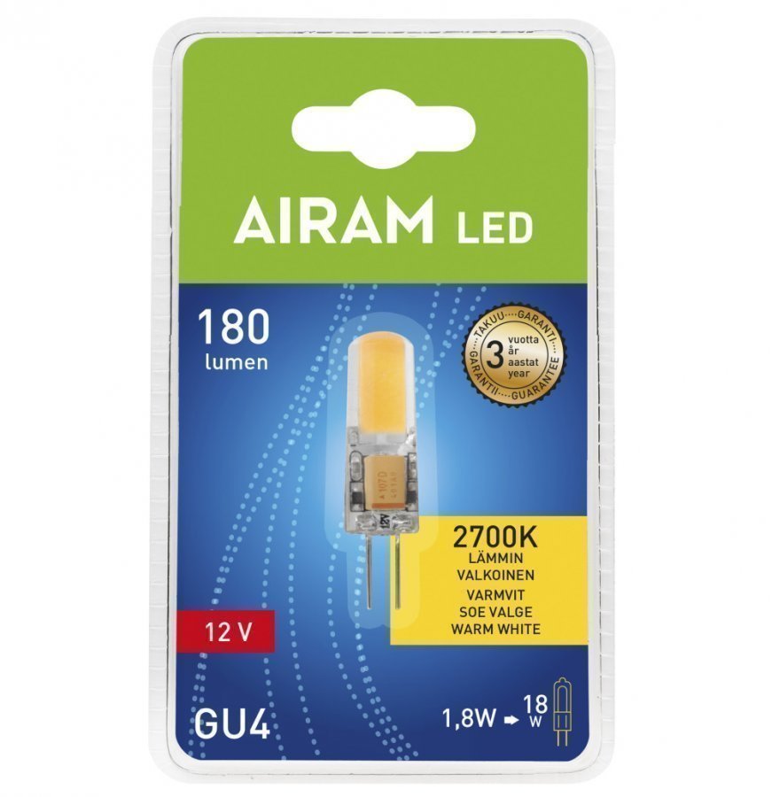 Airam LED-lamppu. GU4-kantainen polttimokupu, 12V AC. 180 lumenia, värilämpötila 2700 kelviniä. Syttyy heti. Polttoikä 15 000h. Ei UV- tai IR-säteilyä. Energialuokka A+. Takuu 3 vuotta.