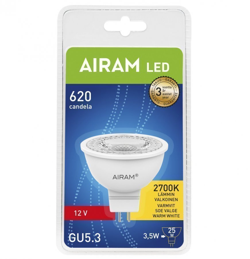 Airam LED-lamppu. Täysi valontuotto heti, myös pakkasessa. Erinomainen valotehokkuus. Ei UV- tai IR-säteilyä. Käyttölämpötila-alue -30°C +40°C. Teho 3,5 W. MR16 GU5,3 (12V) 36° 550CD 25 000h. Takuu 3 vuotta.