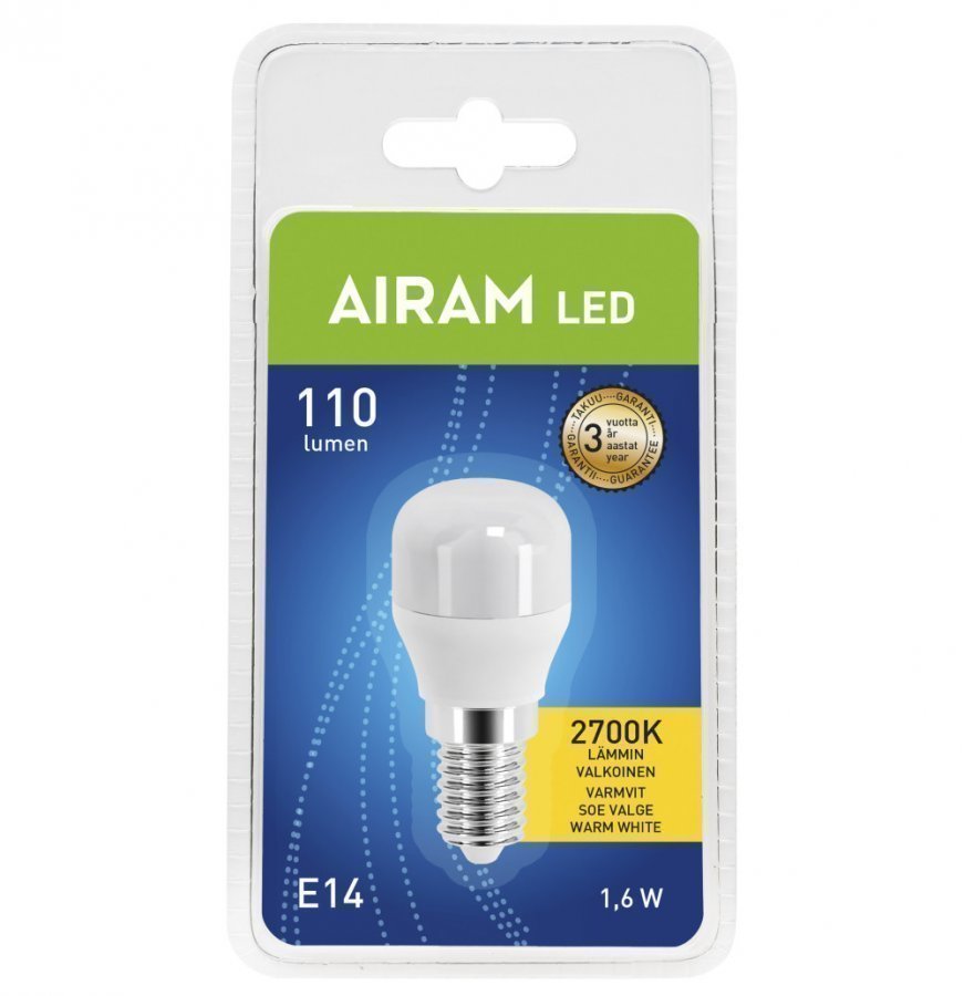 Airam LED-jääkaappilamppu. Teho 2,5 W. Kanta E14. 90lm. 2700K. Käyttöikä 25000 h