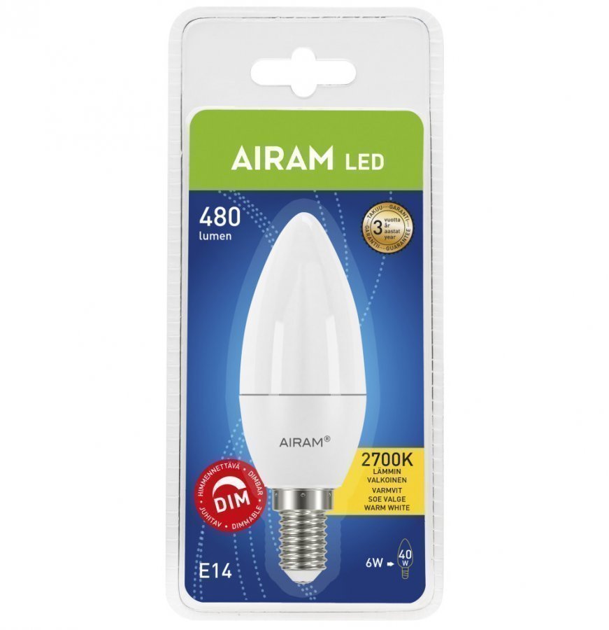 Airam LED-kynttilälamppu. Täysi valontuotto heti, myös pakkasessa. Erinomainen valotehokkuus. Ei UV- tai IR-säteilyä. Käyttölämpötila-alue -30°C +40°C. Teho 6 W. Kanta E14, 470 lm. Takuu 3 vuotta.