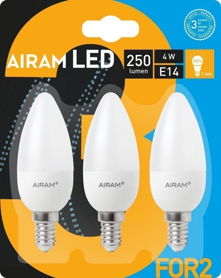 4W kynttilälamppu E14 kannalla. 2800 Kelviniä, 250 lumenia. Täysi valontuotto heti. Polttoikä n.