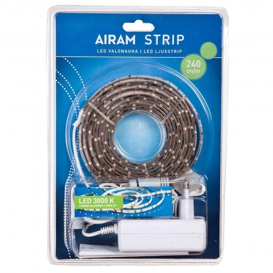 Lämmin valkoinen – 300 kpl LED, 240lm/m – muuntaja DC 12V 2A – teho 24W/5m – P 5000mm x L 8mm – Lyhennettävissä haluttuun pituuteen saksilla 5cm välein – Nopea ja helpoo plug&play-asennus – Mukana valkoinen välijohto 1,6m on/off -kytkimellä – LED nauha IP 44, muuntaja IP20 sijoitettava kuivaan sisätilaan – Kiinnitys 3M teipillä