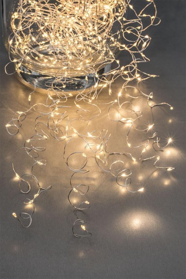 LED-valolankaryhmä sisä- ja ulkokäyttöön. Hopean värinen ohut johto, jossa lämmin keltaiset LEDit 200 kpl, kytketty 10 LEDin sarjaan, ei vaihdettavia, paloikä n. 10 000 h. – pituus 1,1 m, taivuteltavissa eri muotoon – kirkas johto 5 m – muuntaja 12V 3,8VA IP44