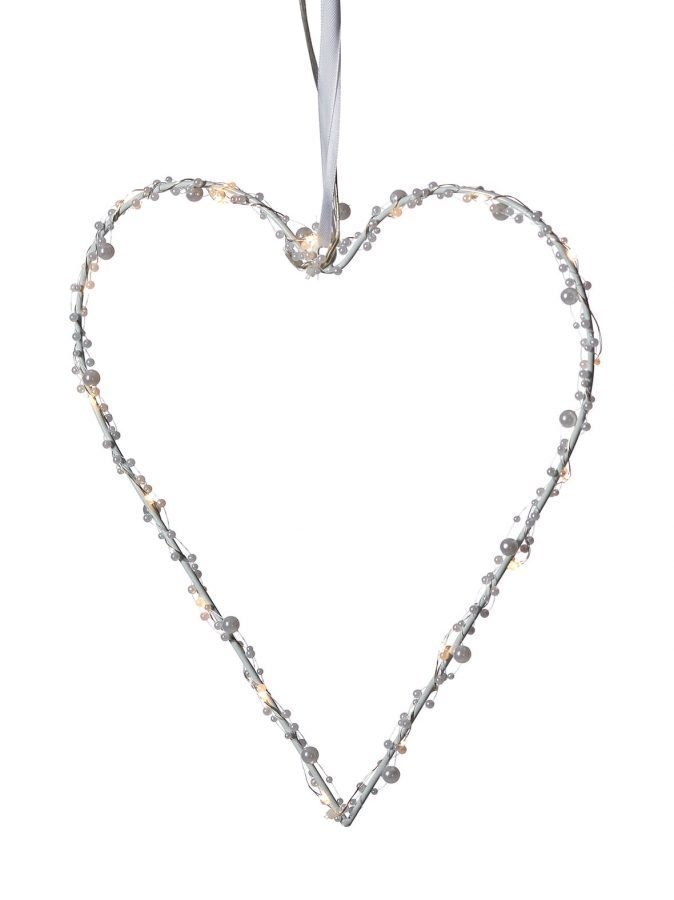 Sydämenmuotoisessa valokoristeessa on nauhaa, keinohelmiä ja 20 kappaletta pieniä lämpimän keltaisia LED:ejä, joita ei voi vaihtaa. LED:ien paloikä on noin 10 000 tuntia. Pakkaus sisältää kolme AAA-paristoa sekä paristokotelon kytkimellä.Koristeen mitat ovat 25 x 28 cm, nauhan pituus 1 metri ja johto 50 cm.