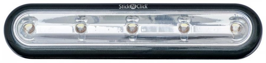 Paristokäyttöinen LED-valaisin. Kiinnitys tarralla. Syttyy ja sammuu painalluksella. Valonlähde: 5 valkoista LEDiä. Virtalähde: paristot 3 x AAA.