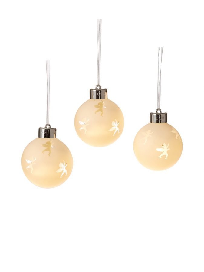 Pakkauksessa on kolme enkelikuvioin somistettua lasipalloa, joihin kytketään valo kaukosäätimellä. Sisäkäyttöön tarkoitetussa lasipallossa on LED-valo sisällä ja ripustusnauha. Mukana tulee myös kolme AAA-paristoa, yksi jokaiseen palloon ja yksi CR2032-paristo kaukosäätimeen. LED:ien paloikä on noin 10 000 tuntia eikä niitä voi vaihtaa. Yhden pallon halkaisija on 8 cm ja nauhan pituus 15 cm.