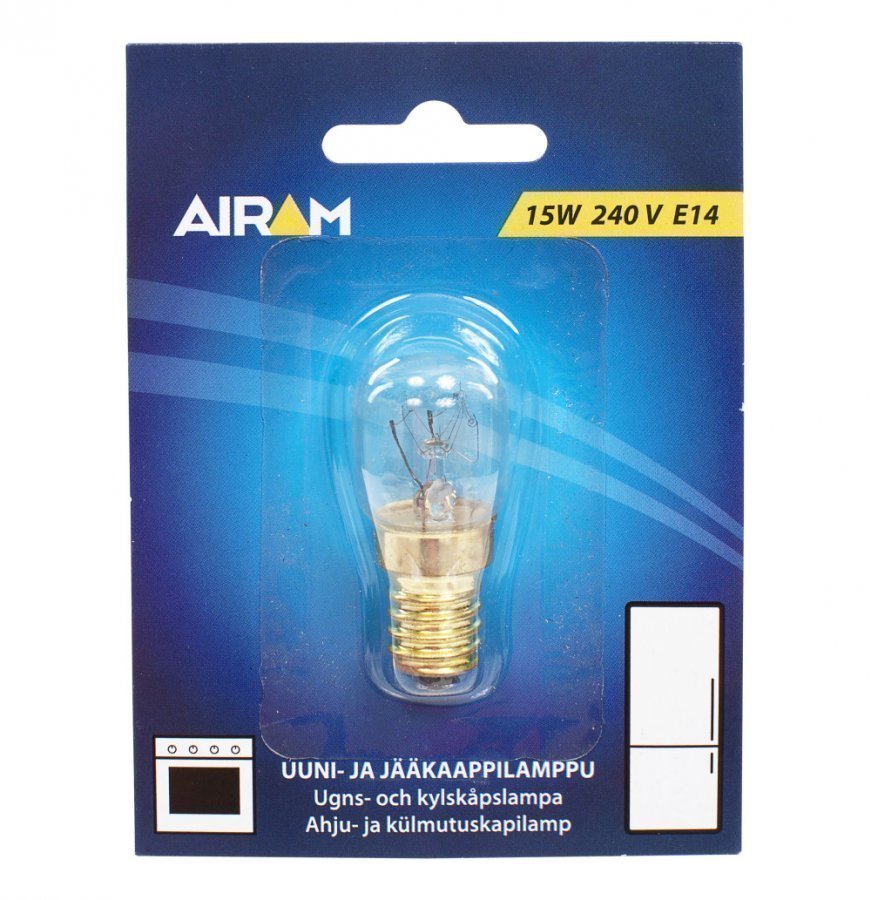 Airam uuni ja jääkaappilamppu. Max. lämpötila 300°C. Lampun pituus 50 mm ja halkaisija 22 mm. Ei sovellu huonevalaistukseen. Energialuokka F. Ominaisuudet: Teho: 15 W Jännite: 240 V 80 lumen E14
