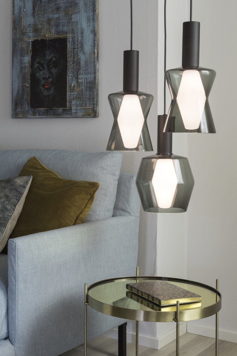Wirkkalan K2-135 valaisinjohto 3,1m, vihertävän harmaa lasikupu, WIR-85 Led-lamppu 8W, E27-kanta, 760lm, 3000k, 15 000h, himmennettävä