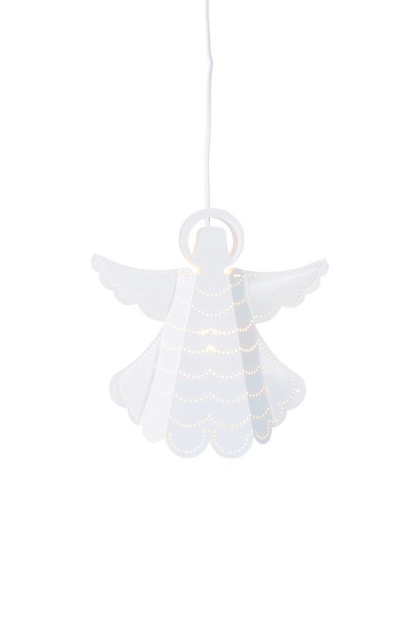 Enkeli valaisee ja luo huoneeseen tunnelmaa. Materiaali: Metallia. Koko: Korkeus 25 cm. Leveys 24 cm. Syvyys 4,5 cm. Kuvaus: Metallienkeli, jossa valo. Sisäkäyttöön. Johto 3,5 m. Vinkki: Kun ripustat monta enkeliä eri korkeuksille, luot näyttävän vaikutelman.