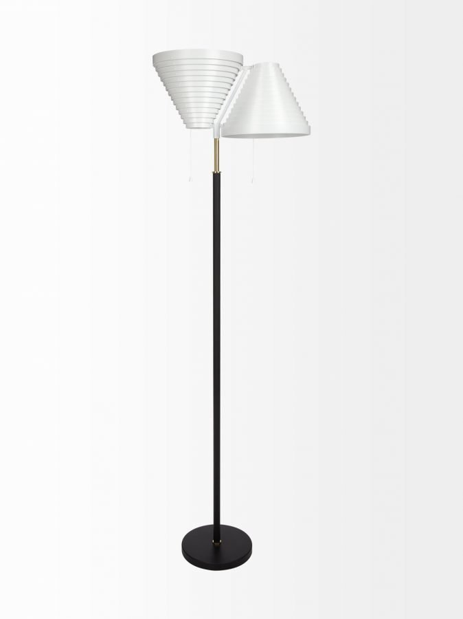 Alvar Aalto suunnitteli ajattoman ja yksinkertaisen hienostuneen lattiavalaisimen vuonna 1959. Valaisimessa on kaksi valkoiseksi maalattua, käsinniitattua teräslamellivarjostinta. Jalusta ja varsi on päällystetty tyylikkäästi mustalla nahalla, johto on mustaa muovia. Varren yläosassa on kiillotettua messinkiä. Valonlähteeksi sopii 2 x 20 W energiansäästölamppu tai 2 x 100 W hehkulamppu, kanta E27. Korkeus 165 cm, halkaisija 48 cm.
