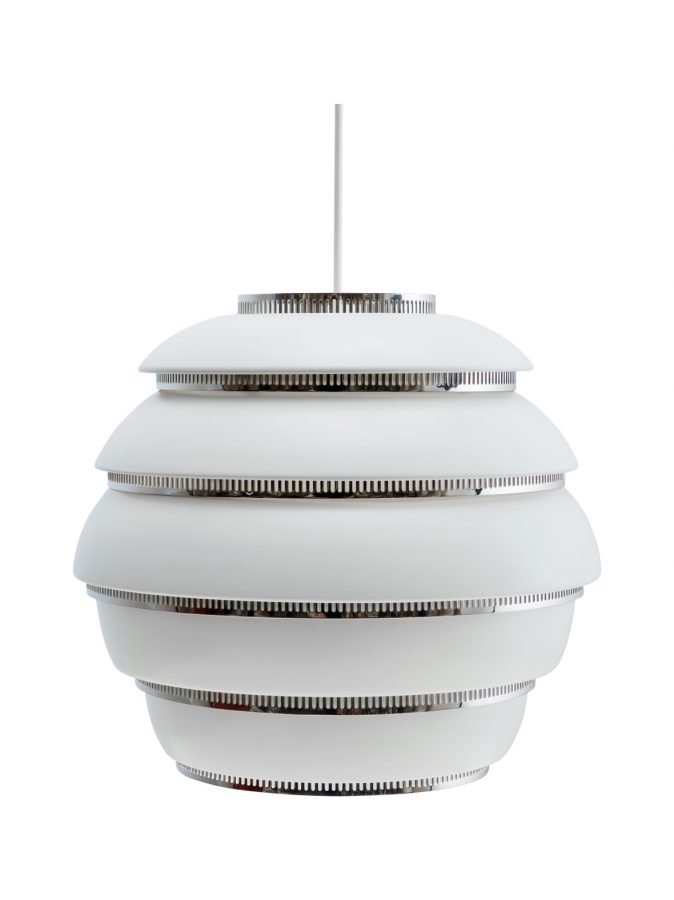 Alvar Aallon 1953 suunnittelema valaisin. Materiaali on valkoiseksi maalattua alumiinia. Kiillotetut kromirenkaat.