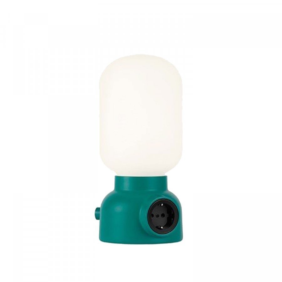 Plug lamp pöytävalaisin merkiltä atelj Lyktan, suunnittelija Form Us With Love. Pöytävalaisin vihreää painevalettua alumiinia ja kupu opaalilasia. Jännittävänmuotoisen valaisimen jalustassa on kätevä, integroitu pistorasia, joka mahdollistaa usean valaisimen sarjaliitännän tai älypuhelimen, tabletin tai kannettavan tietokoneen lataamisen. Valaisimessa on LED-valonlähde ja sisäänrakennettu himmennin.