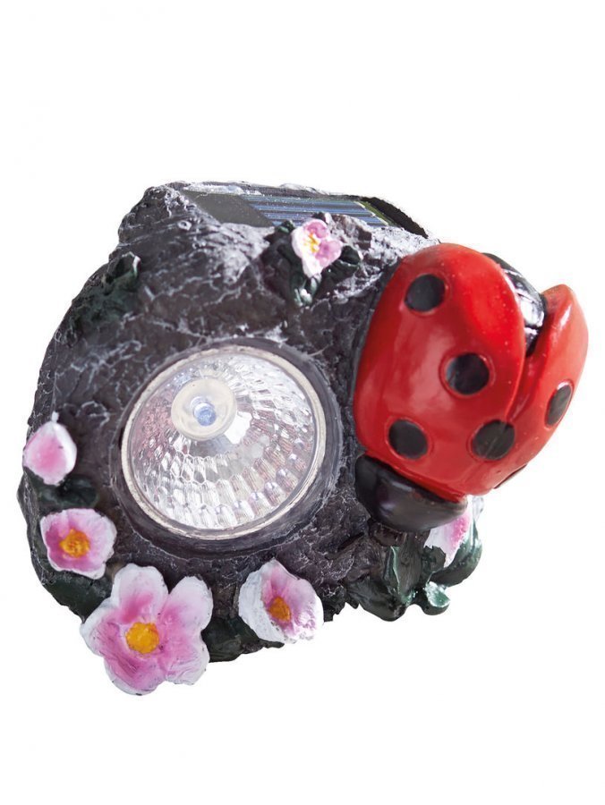 Säänkestävä aurinkokennovalo, jossa on käsinmaalattu leppäkerttu ja kukkakoristus. Integroitu aurinkopaneeli, jossa on LED-lamppu. Loistaa tunnelmallista valoa ympärilleen. Mitat n. 15 x 14,5 x 15 cm. Materiaali resiiniä.