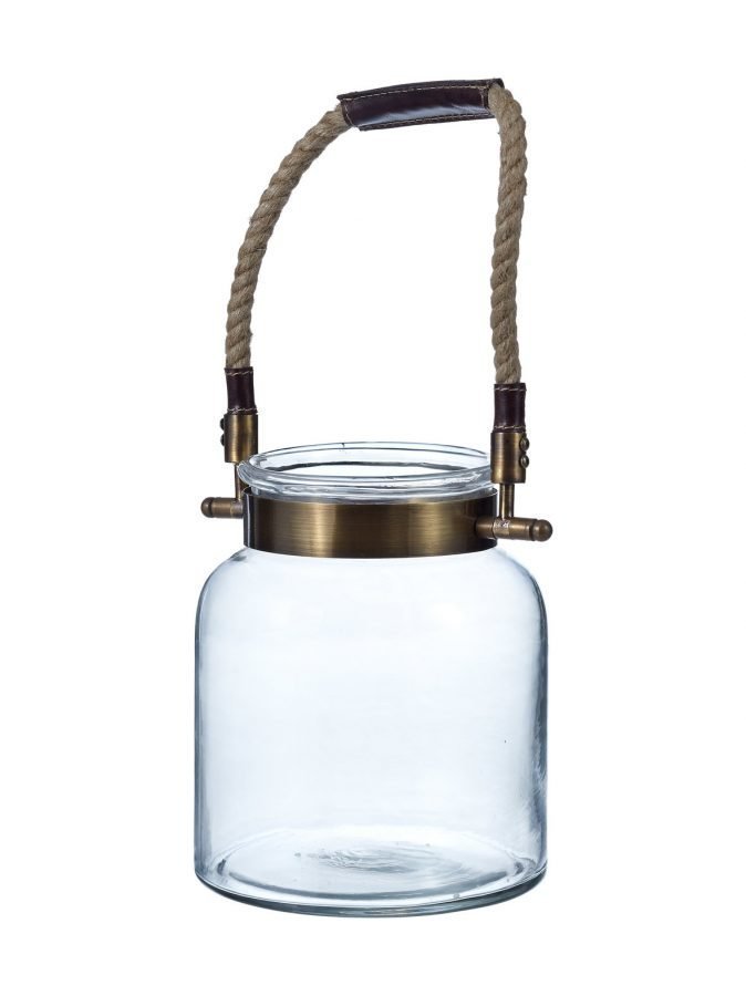Tukevassa lasilyhdyssä on metallinen kehikko, jossa on punottu ripustusnyöri keinonahkasomistein. Pohjan halkaisija on 18 cm, korkeus 23 cm.Materiaali on lasia ja metallia.