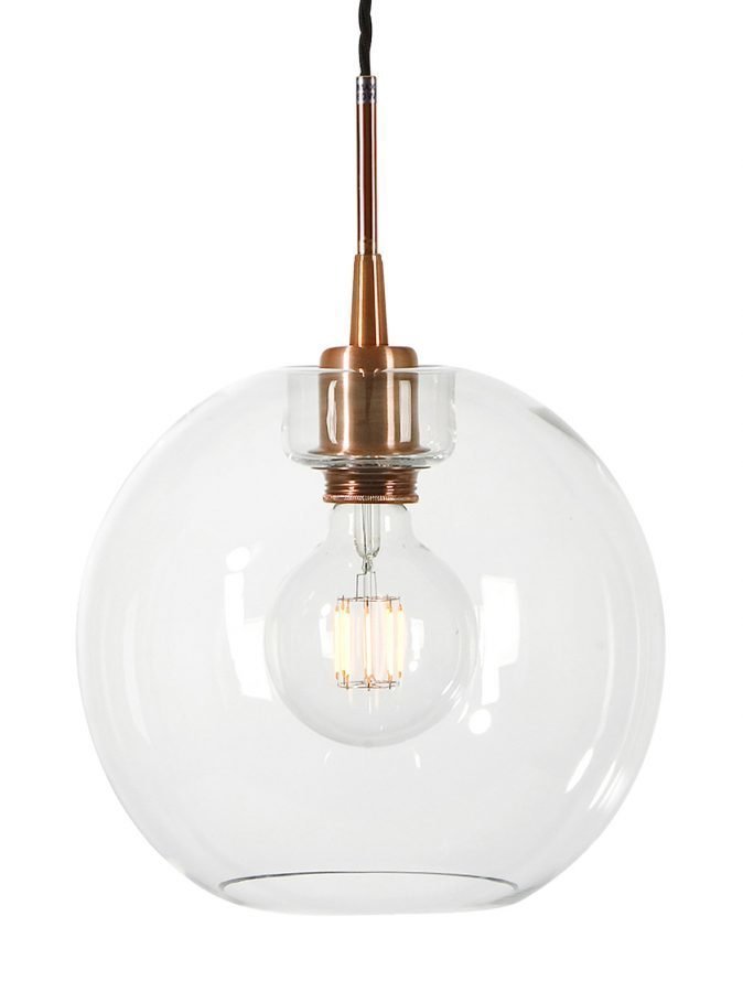 Pyöreässä riippuvalaisimessa on kirkas, pyöreä lasikupu ja kuparinvärinen metallirunko. Valaisin kiinnitetään kattokoukkuun. Valaisimessa on 1,7 m pitkä johto, joka on päällystetty mustalla tekstiilillä. Valaisimeen sopii 60 W E27-kantainen lamppu, joka ei sisälly pakkaukseen. Jännite 230 V. Halkaisija on 32 cm ja korkeus 29 cm.T1073-13-18