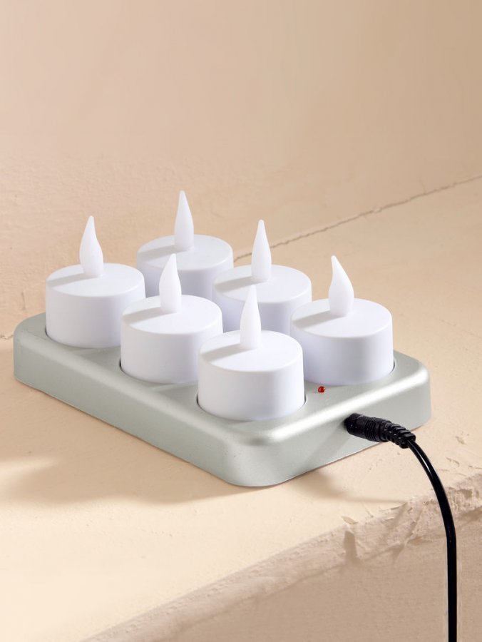 Energiaasäästävä, ladattava 6-osainen LED-tuikkukynttiläsetti ja laturi. Väreilevä liekki antaa erittäin aidon vaikutelman.