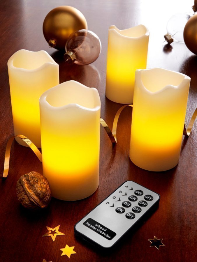 Kaukosäätimellä toimiva 4-os. LED-vahakynttiläsetti. Lepattava kynttilänvalo. Erikseen kytkettävät kynttilät, sisältää 3x CR2032 nappiparistoa kynttilöille sekä 1x CR2032 nappipariston kaukosäätimelle. K/halkaisija n. 16/10 cm.