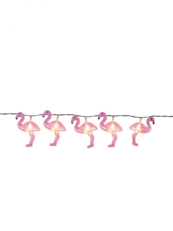Puutarhajuhliin, lastenjuhliin tai koristeeksi kotiin: tämä hauska valosarja vetää katseita puoleensa. Sen avulla voit luoda leikkisiä sisustusyksityiskohtia tai kauniin valaistuksen huoneen pimeään nurkkaan. Valosarjassa on 10 flamingon sisään piilotettua, lämpimän valkoista valoa loistavaa hohtodiodia. Valosarja toimii kolmella (3) AA-paristolla ja siinä on ajastustoiminto. Paristot eivät kuulu toimitukseen. Materiaali muovia. Mitat: pituus n. 180 cm, virtajohdon pituus n. 50 cm, flamingojen KxL n. 10 x 3 cm.