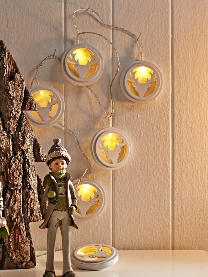 LED-valosarja, jossa lämpimän valkoiset hohtodiodit loistavat kauniisti vaaleasta puusta valmistettujen hirvenpääkuvioiden takaa. Valosarja on paristokäyttöinen ja se toimii kolmella (3) AA-paristolla, jotka eivät kuulu toimitukseen. Valosarjassa on myös ajastin. Valosarjan pituus n. 1,8 metriä.