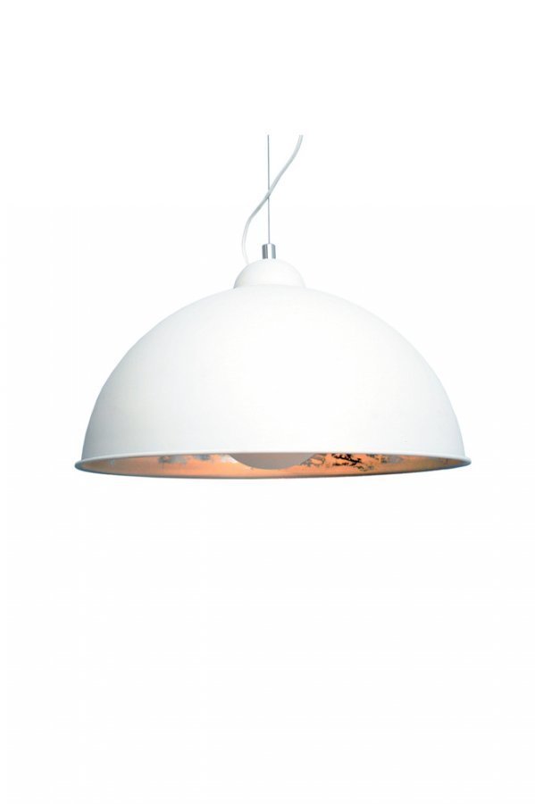Mattapintaista valkoista metallia, hopeanvärinen sisäpuoli ja häikäisysuoja. Valkoinen kangasjohto ja vaijeri. Halkaisija 53 cm. E27-lampunpidike. Tilaa lamppu erikseen.