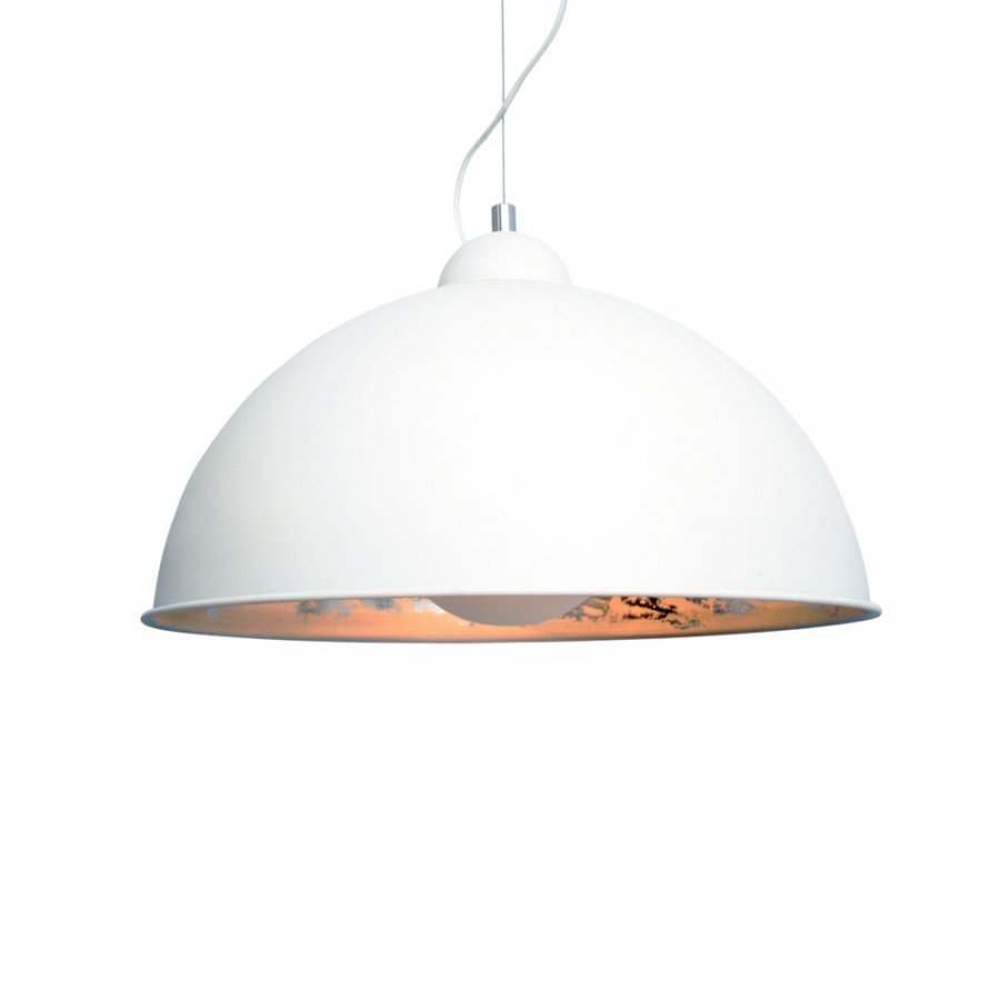 Mattapintaista valkoista metallia, hopeanvärinen sisäpuoli ja häikäisysuoja. Valkoinen kangasjohto ja vaijeri. Halkaisija 53 cm. E27-lampunpidike. Tilaa lamppu erikseen.