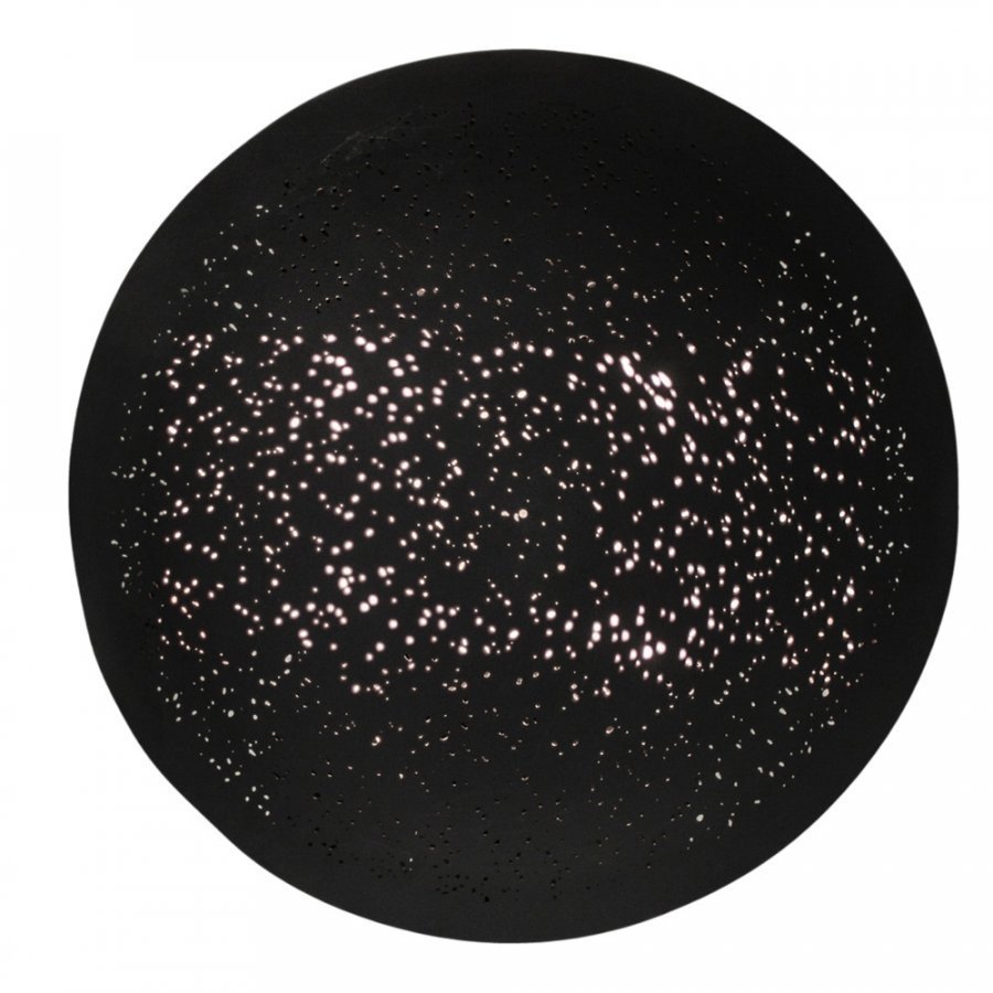 Colby-seinävalaisin on huoneen katseenvangitsija. Pyöreän valaisimen halkaisija 71 cm. Mustaa metallia, jossa pieniä reikiä reikäkuvio siivilöi kauniisti valoa. 4 E14-valonlähteen paikkaa ja kirkas johto. Asennetaan seinälle. Watit enintään: 40 W Voltit: 230 V Lampunkanta: 4xE14 Valonlähteet eivät mukana. Materiaali: Metallia Mitat: Ø: 71 cm
