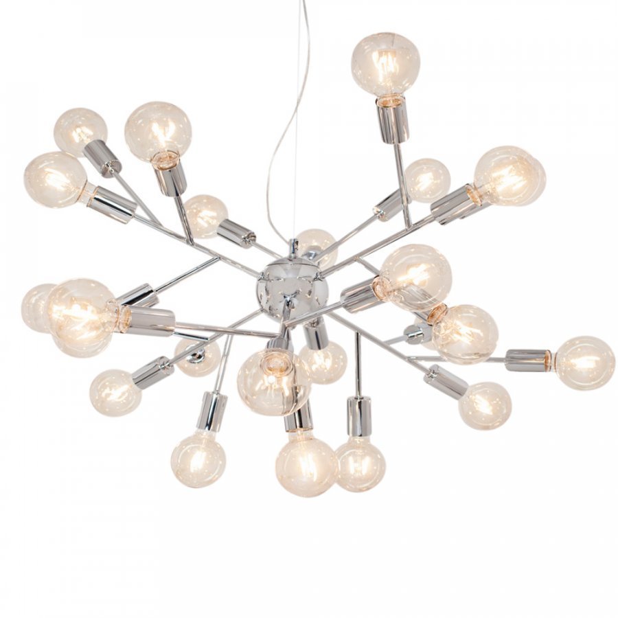 Krominvärinen Hero-kattovalaisin, halkaisija 80 cm, korkeus ilman valonlähteitä 50 cm. 120 cm:n läpinäkyvä johto, krominvärinen metallinen kattokuppi ja ripustussarja. 24 x E27, enintään 40 W. Tilaa valonlähteet erikseen Enintään volttia/wattia: 230 V/40 W Lampunkanta: 24xE27 Valonlähteet eivät ole mukana Materiaali: Metallia Mitat: K: 50 cm, halkaisija: 80 cm