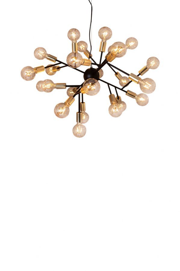Hero-kattovalaisin, jossa 24 mattamessinkistä lampunpidikettä, kanta E27. 120 cm:n pituinen musta kangaspäällysteinen johto. Kattokuppi mustaa metallia. Ø 80 cm, korkeus 50 cm. Lamput eivät mukana. Suositeltavat lamput: Ø 95 mm hehkulappu 18W tai LED-lamppu 4 W.
