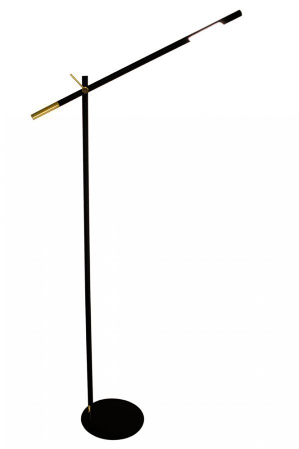 Musta lattiavalaisin, jossa messinginväriset detaljit. Suunnattava korkeus. Himmennin. K: 120 cm, S: 70 cm, P: 23 cm. Lamppu LED 5 W (mukana), johto 2 m.