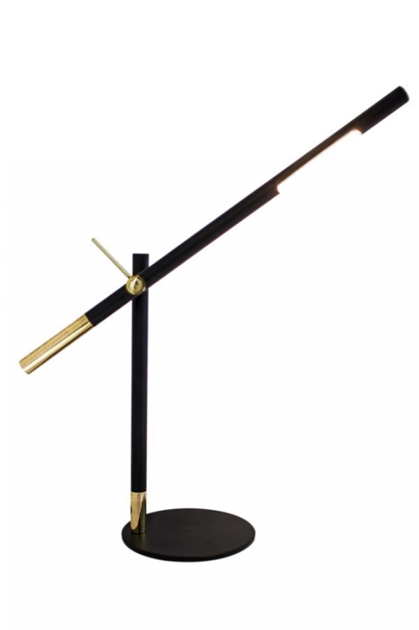 Pöytävalaisin, jossa messinginväriset detaljit. Säädettävä korkeus. Himmennin varren yläosassa. K 33 cm, L 50 cm, P 16 cm. LED-lamppu 5 W (mukana). Johto 2 m.