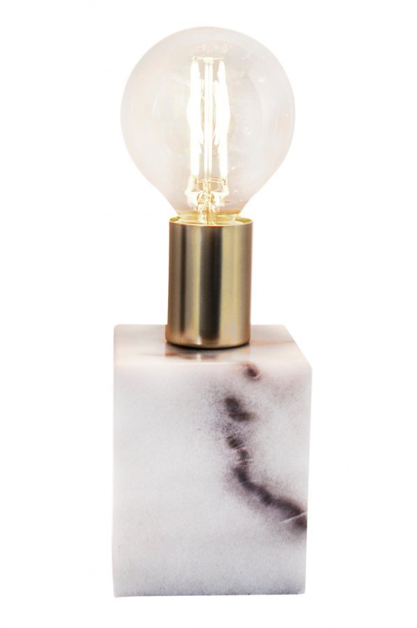 Pöytävalaisin marmoria. Messinginväriset detaljit. K 18,5 cm, S 10 cm. Iso lampunkanta E27. Enintään 60 W. Läpikuultava 2-metrinen johto, jossa katkaisin ja pistoke.