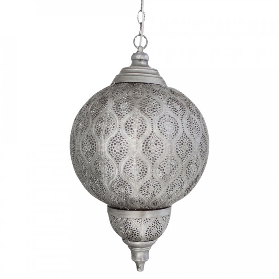 Melton-kattovalaisin vie ajatukset itämaihin. Antiikkihopeanvärinen valaisin tuntuu uudelta ja jännittävältä. Yhteensopiva metallinen kattokuppi. Valo läpäisee kauniisti reikäkuvioidun metallipinnan. Korkeus 50 cm ja halkaisija 30 cm. Enintään 230V/60W Lampunkanta: E27 Lamppu ei mukana Materiaali: Metallia Mitat: K: 53 cm, Ø: 30 cm