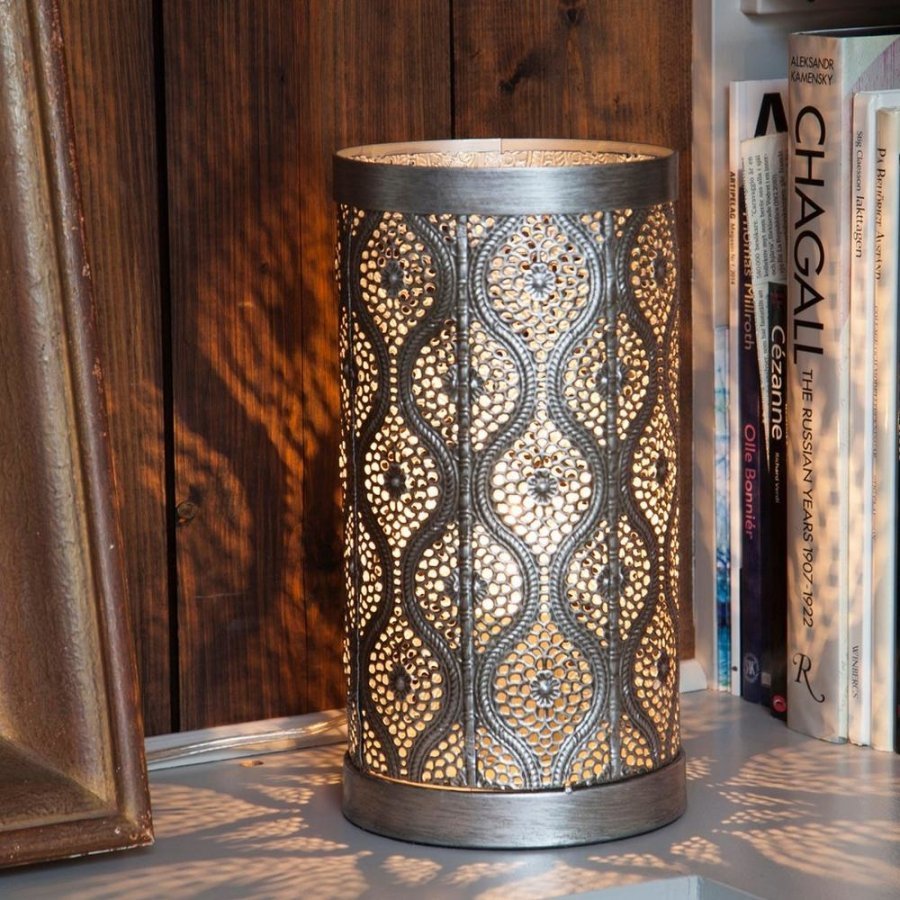Melton-pöytävalaisin antiikkihopeanväristä metallia. Korkeus 30 cm, halkaisija 15 cm. E27, 40 W. Valonlähde ei mukana.