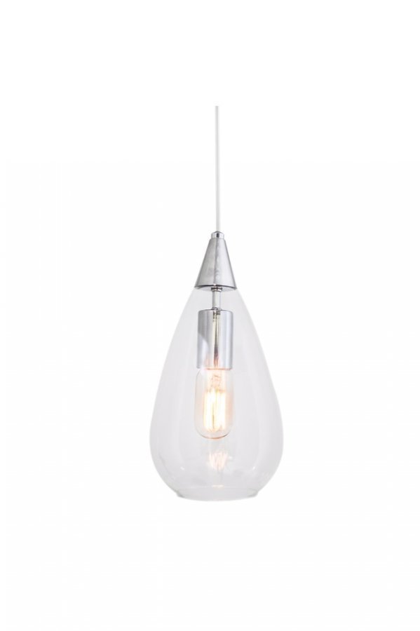 Kattovalaisin kirkasta lasia. Lampunpidike kromia. Lampunkanta E27. Enintään 60 w (ei mukana). K: 30 cm, ø: 24 cm. 1,2 metrin mittainen läpikuultava johto. Kattokuppi kromia. Kattokoukku.