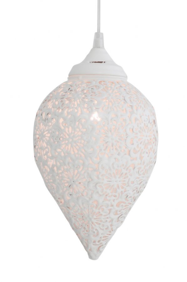 Pisaranmuotoinen ikkunavalaisin valkoista metallia. Korkeus 25 cm. Läpikuultava johto, jossa valonkatkaisin, pituus 3,5 m. Lampunkanta E14, enintään 40 W. Lamppu ei sisälly toimitukseen.