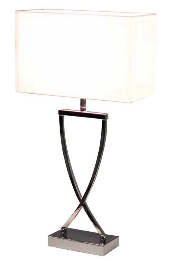 Jalka krominväristä metallia. Varjostin kangasta. Korkeus 52 cm. Varjostimen mitat: 27×12 cm, korkeus 17 cm. Kanta E27. Läpikuultava johto 170 cm, johdossa katkaisin. Lamppu ei mukana.