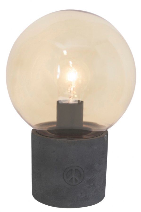 Peacebubbles-pöytävalaisin, jonka kupu värillistä lasia ja jalka harmaata betonia. Jalassa kaiverrettu rauhanmerkki. Korkeus 23 cm, Ø 20 cm, E27-lampunpidike, 40 W, musta johto. Design Åsa Gessle.