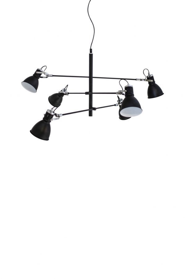 Pigalle-kattovalaisin mattamustaa metallia. Krominväriset detaljit. ø: 90 cm. Keskellä olevan pyöreän tangon kokonaiskorkeus 34 cm. 6xE27, isot lampunkannat. Enintään 40 W (lamput eivät ole mukana). 1,2-metrinen musta johto. Vaijeri. Kattokuppi mattamustaa metallia. Koukkuripustus.