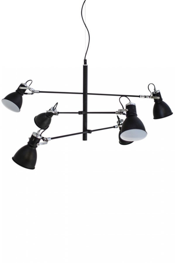 Pigalle-kattovalaisin mattamustaa metallia. Krominväriset detaljit. ø: 90 cm. 6xE27, isot lampunkannat. Enintään 40 W (lamput eivät ole mukana). 1,2-metrinen musta johto. Vaijeri. Kattokuppi mattamustaa metallia. Koukkuripustus.