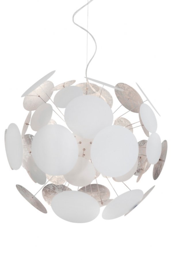Planet-kattovalaisin. Mustassa kullanvärinen sisäpinta ja valkoisessa hopeanvärinen sisäpinta. ø 50 cm. 4xE14 (pieni lampunkanta). Enintään 25 W. Lamput eivät ole mukana. Kirkas johto 120 cm, johdossa vaijeri. Kattokuppi mustaa metallia.