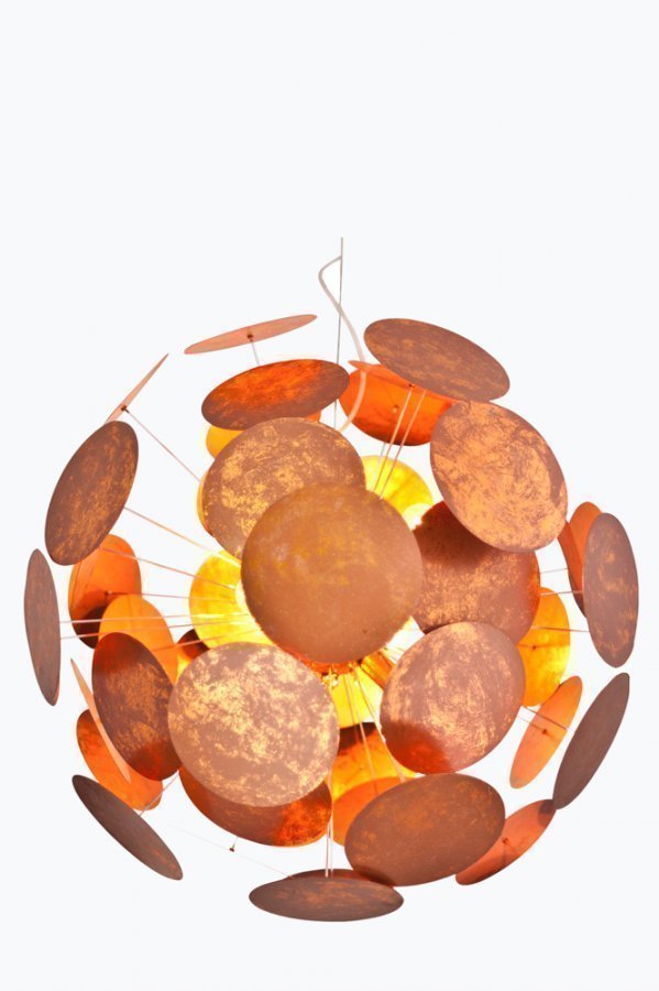 Harjattua kuparia. Kirkas johto 1,2 m, johdossa vaijeri. ø 65 cm. Pienet lampunkannat 6xE14, enintään 25 W.