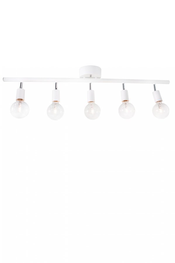 Row-spottivalaisin. Hiekanvalkoinen. Pituus 100 cm, korkeus 20 cm. 5 x iso nivelletty lampunkanta E27. Enintään 60 W. Lamput eivät ole mukana. Ripustetaan kattokoukkuun. Design Katarina Dahl.