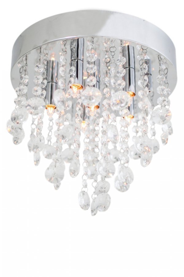 Plafondi metallia. Prismat kirkasta lasia. K 30 cm, ø 35 cm. 9xG9. Enintään 40 W. 28 W:n lamput mukana. Koukkuripustus.