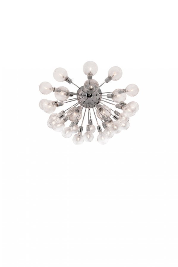 Sunshine Grande -kattovalaisin. ø 80 cm, korkeus 40 cm. 28 x iso lampunkanta E27. Lamput eivät ole mukana. Ripustetaan kattokoukkuun. Himmentimen kytkemistä valaisimeen suositellaan (1000 W:n himmennin, kun käytetään 30 W:n lamppuja). Design Anders Eriksson.